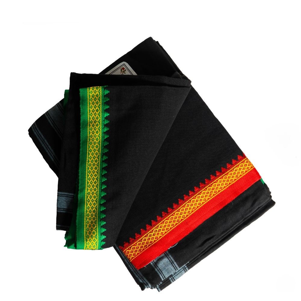 This dhoti features a rich black base complemented by a vibrant green and gold zari border, adding a striking contrast and traditional charm. The subtle woven stripes enhance its overall look, making it suitable for both simple occasions and cultural gatherings.